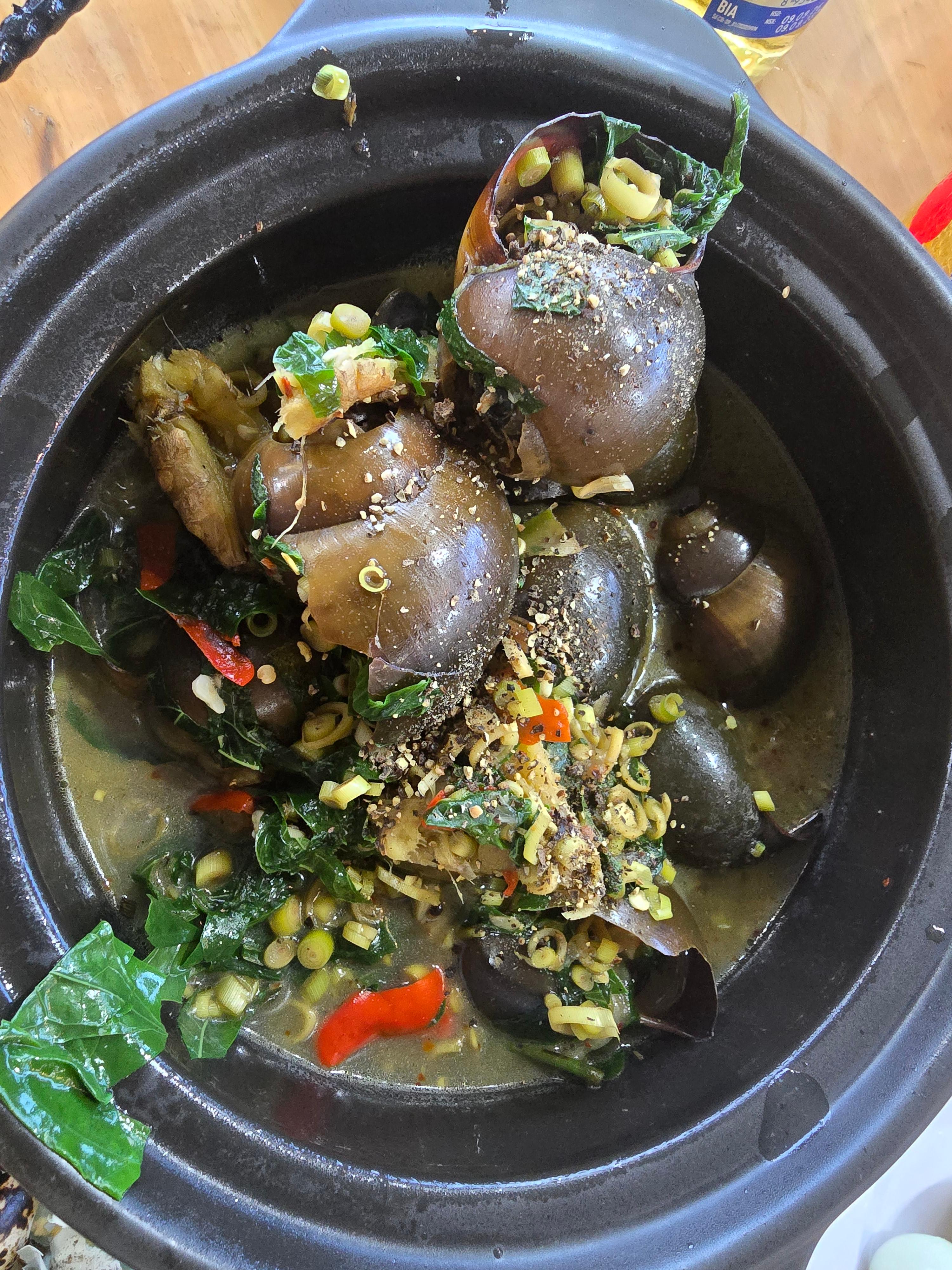 신선한 민물 소라를 허브, 고추, 레몬그라스, 생강, 그리고 쌀국수 육수로 함께 끓여낸 이 음식은